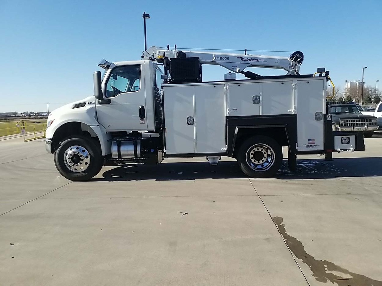 For sale in Meridian, MS, we have a brand-new 2025 International MV 4X2 Reg Cab equipped with a 11' Maintainer SIG 2 service body. This impressive truck features pressurized compartments, a 26-inch steel workbench bumper, and a protective spray coating. ** Body Specs: The truck boasts a 25-foot boom with a 10,000-pound capacity tall tower crane. This crane comes complete with a planetary winch and a wireless remote for efficient operation. VMAC H40 40CFM Rotary Screw Air Compressor: Perfect for powering pneumatic tools on the go. Toolboxes: Four toolboxes provide ample storage space for equipment and supplies. Bolts Bins: Keep your bolts and small parts organized with the included set of bins. Battery-Powered Tool Storage: Conveniently store and charge your battery-powered tools. Inverter: Power electronic devices while on the job. Hydraulic Outriggers (Up/Down and Extension):Ensure stability during crane operations. Work Lights: Facing Sides: Illuminate your workspace for safety and efficiency. Rear and Boom Tip (Facing Down): Enhance visibility during nighttime or low-light conditions. Strobe Lightheads: Front Grill: Improve visibility to other drivers. Rectangular Strobes (Rear Bumper): Enhance safety on the road. Headache Rack with Light Bar: Protect the cab and provide additional lighting. Strobe Lights and Brake Lights: Ensure visibility and compliance with regulations. Torch reel and 3/4 air line is plumbed directly from the air tank to the rear of the body.